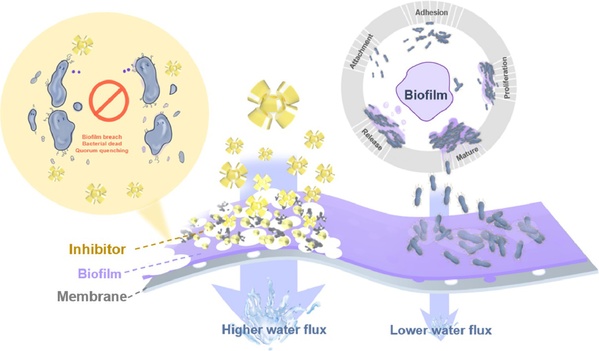 生物污染是阻碍膜分离技术稳定运行的关键瓶颈。群体感应淬灭被证实是有效缓解生物污染的方法,但活细菌在膜表面的持续积累仍然会诱导污染形成。基于此,该项研究提出群体感应淬灭和抑菌协同控制生物污染的策略。研究发现抑制剂显著降低了细菌粘附、毒力、运动和生物膜合成等关键基因的表达,抑制剂通过降低EPS分泌和生物膜形成,缓解了水通量下降。该研究表明群体感应淬灭和抑菌性的协同作用有效控制了生物污染,为膜技术在污水处理中的应用提供了一种简单而可持续的方法。