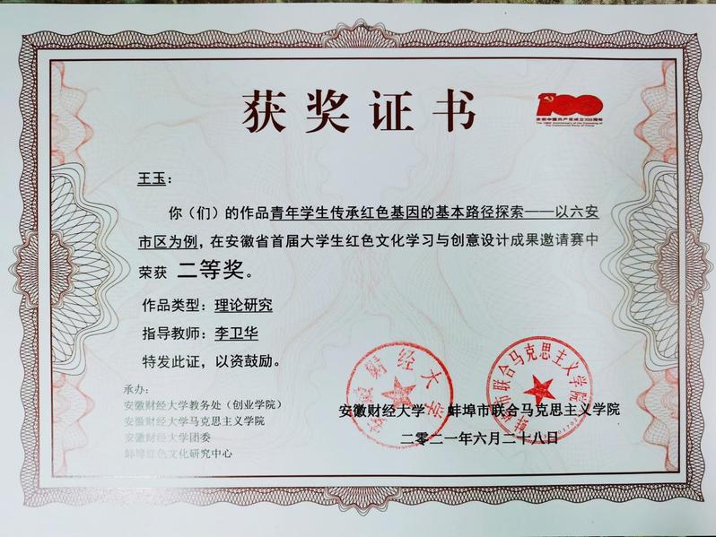 近日,由安徽财经大学、蚌埠市联合马克思主义学院主办的安徽省首届大学生红色文化学习与创意设计成果邀请赛获奖名单公布,我院研究生王玉创作的《青年学生传承红色基因的基本路径探索——以六安市区为例》荣获二等奖、高永久创作的《“小推车”精神和淮海战役的胜利研究》荣获三等奖。