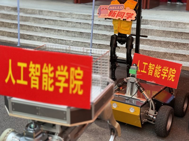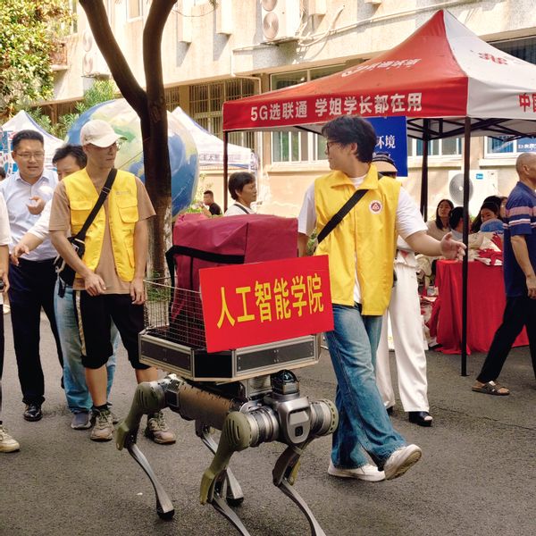 智科系教师党支部根据学院党委要求,创新引入人工智能实验室的机器狗“小智”、智能车“云擎”等产品运送行李服务。机器狗“小智”高效协助新生搬运行李,吸引众多新生及家长驻足观看。上下楼梯、规避识别障碍物、负重运输,一系列操作让新同学们直观感受前沿科技带来的无穷魅力,对所学专业有了直观而生动的初印象。“云擎”移动机器人智能车是我系汪步云教授团队开发、拥有完全知识产权的成果,具备优秀的移动和搬运能力,可执行高难度,复杂动作。多方位的展示,身临其境的体验,引导新生在科技氛围中开启大学新生活。