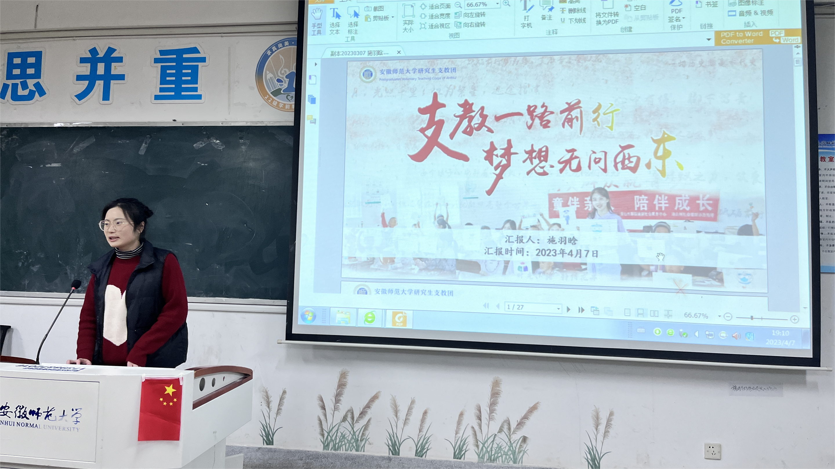 研支团成员施羽晗和夏卓妍向同学们分享研支团的经历。施羽晗身为第十届支教团的成员,2018年到2023年,从倾听者转变为讲述者,从安徽出发,奔向祖国西南地区,关爱留守儿童,参加公益活动,开展农村青年创业课。将温暖传递下去,将脱贫攻坚的国家号召落实到实处。她送给学员们一句话:“用一年的时间去做一件终身难忘的事”。她希望启蒙班的同学们可以明确心中的目标,不断努力。夏卓妍从“启蒙”二字入手,2018年研支团的启蒙,初中支教老师回校的启蒙,她最终以“去经历,便知安定”为支教宣言,背起行囊,开始了自己的支教之旅。在支教的过程中,她用心对待工作,将自己的所学毫无保留地交给支教地区的孩子们。最后夏卓妍用“见、审、思、行”四字和学员们共勉。