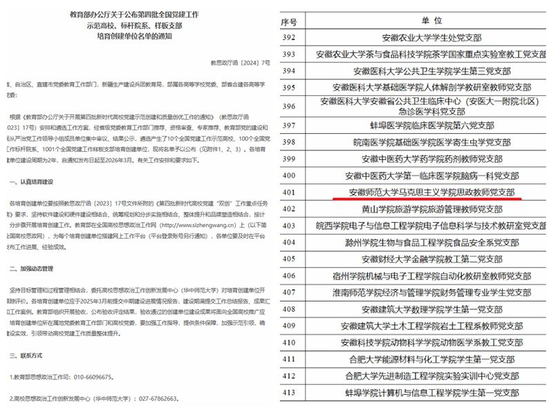 日前,教育部办公厅公布了第四批全国党建示范高校、标杆院系、样板支部培育创建单位名单,思政教师党支部成功入选第四批“全国党建工作样板支部”培育创建单位。