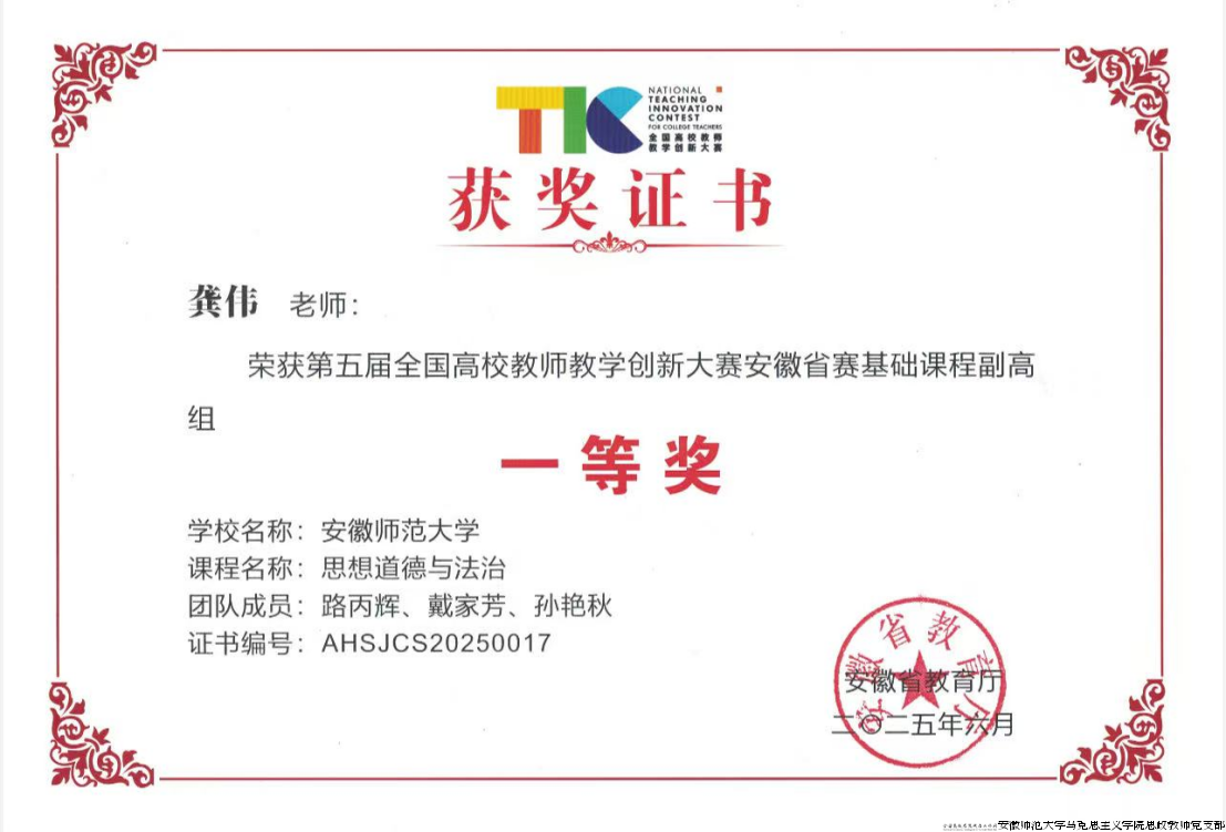 近日,思政教师党支部青年教师龚伟副教授荣获第五届高效教师教学创新大赛安徽省赛基础课程副高组一等奖。据悉,思政教师党支部秉持党建引领事业发展的理念,将备赛准备全程融入主题党日活动,专题就创新报告、教学设计、模拟比赛等环节进行集体学习研讨。该项教学比赛佳绩的获得,彰显了支部投身强国行的具体举措。