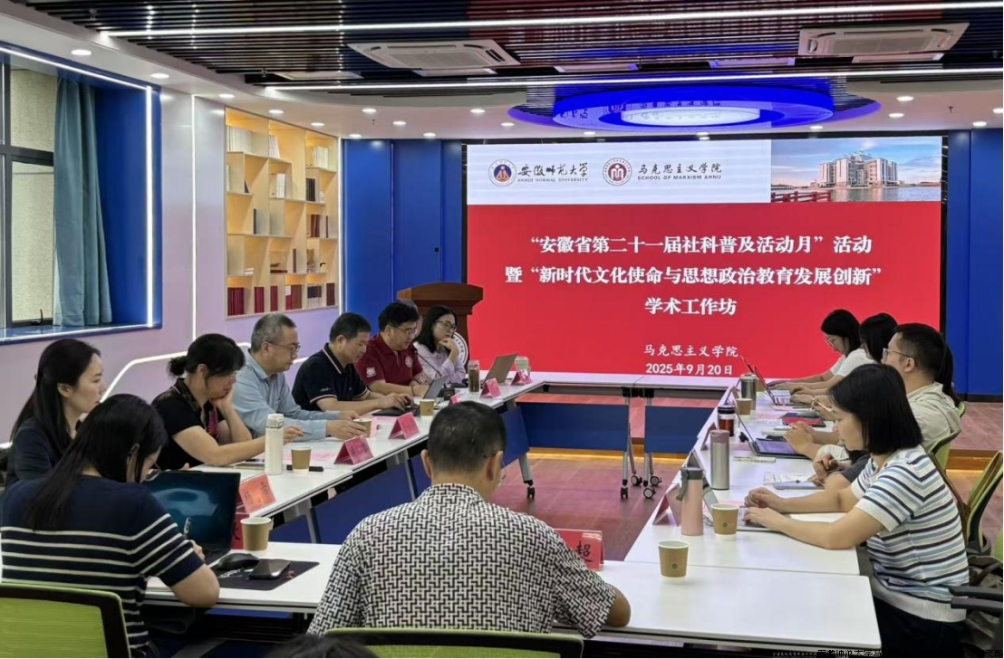 2025年9月20日,安徽师范大学马克思主义学院三楼情景模拟实验室成功举办“安徽省第二十一届社科普及活动月”活动暨“新时代文化使命与思想政治教育发展创新”学术工作坊。本次活动由思政教师党支部主体策划,特邀思想政治教育学科相关刊物编审专家、上海交通大学史宏波教授、上海理工大学卢岚教授、学院王习胜教授出席指导,学院青年教师、思想政治教育学位点的博士生、硕士生代表等40余人现场参加本次学术活动。