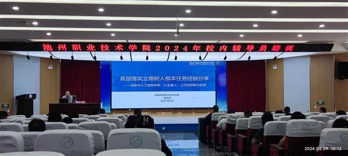 近日,池州职业技术学院举办了2024年校内辅导员培训班,本次培训班由我校参与协办。选派学院党总支副书记、副院长周正贵赴池州职业技术学院开展工作培训,就三全育人、学生管理等方面与该校学管队伍展开工作交流。
