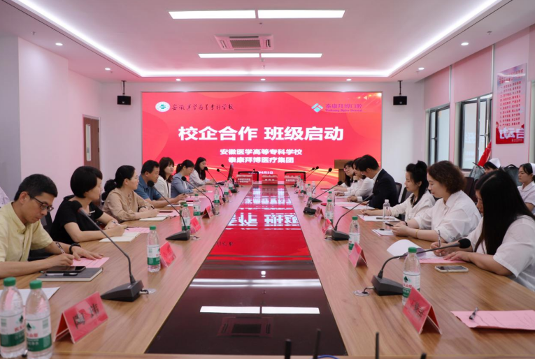 6月5日下午,我校与泰康拜博医疗集团有限公司举行“泰康口腔班”启动仪式暨校企合作座谈会。我校党委委员、副校长严继贵,党委委员、教务处处长朱霖,护理学院党政班子成员、部分专任教师及泰康保险集团管委会成员、泰康拜博口腔首席执行官陈宏华一行6人出席本次签约仪式。