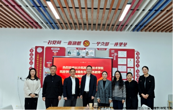 为深化专业领域交流合作,共探人才培养新路径,2025年11月3日下午,长沙民政职业技术学院民政与社会工作学院民政服务与管理系副主任刘军一行来校交流,安徽职业技术大学公共管理学院副院长王家祥、社区公益管理教研室主任王小凡、副主任朱畅及教师代表参会。