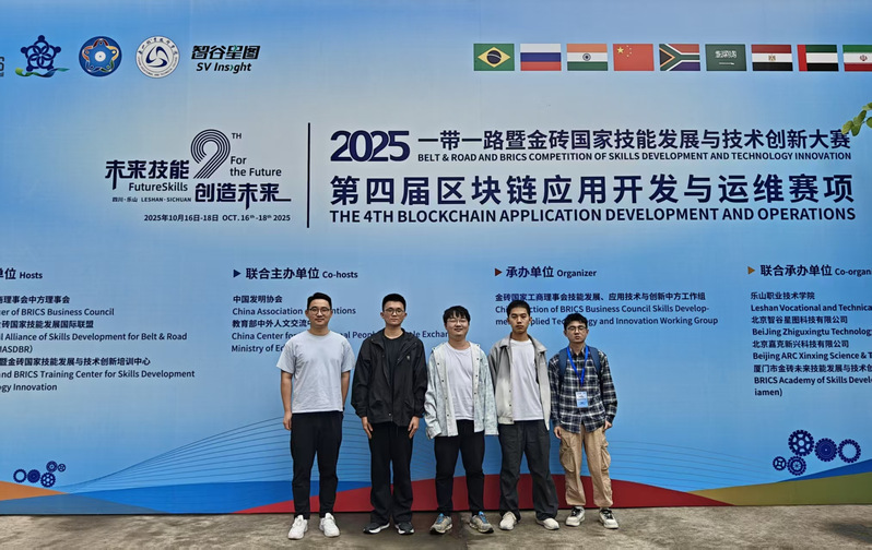 10月19日,2025年一带一路暨金砖国家技能发展与技术创新大赛之第四届区块链应用开发与运维赛项在乐山职业技术学院落幕。来自国内外的120余支队伍同台竞技,经过激烈角逐,安徽职业技术大学派出的两支代表队分别获得二等奖、三等奖。