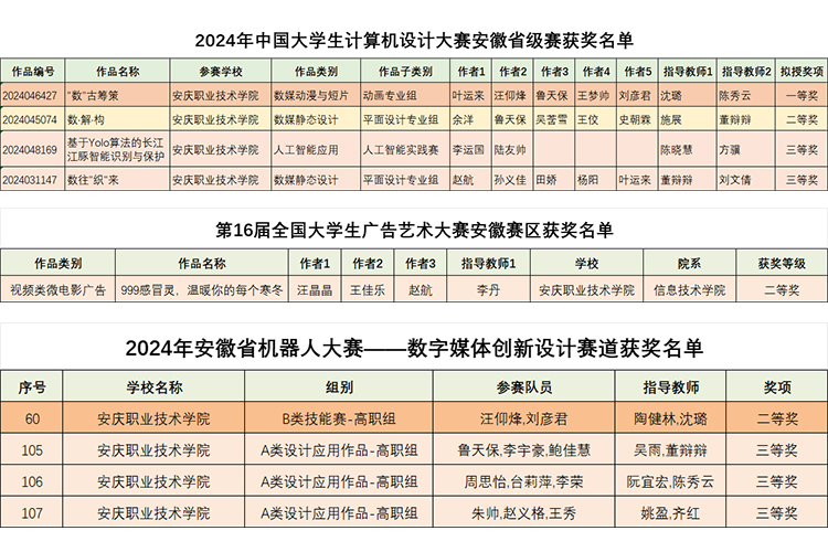 在安徽省教育厅《关于公布2024年3月至6月安徽省大学生学科和技能竞赛部分赛事获奖名单的通知》(皖教秘高﹝2024﹞85号)中,陶健林、沈璐老师指导的汪仰烽、刘彦君学生团队获得2024年安徽省机器人大赛——数字媒体创新设计赛道“B类技能赛-高职组”二等奖;吴雨、董辩辩、阮宜宏、陈秀云、姚盈、齐红老师指导的学生团队共获得“A类设计应用作品-高职组”三等奖3项。