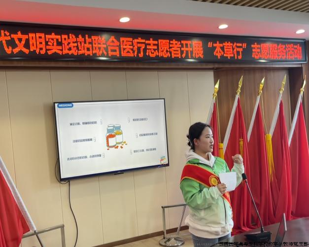 药学院专职辅导员高艺洋,发挥自身专业优势,为社区居民和工作人员进行日常用药常识内容讲解,并指导各位老年人合理用药。