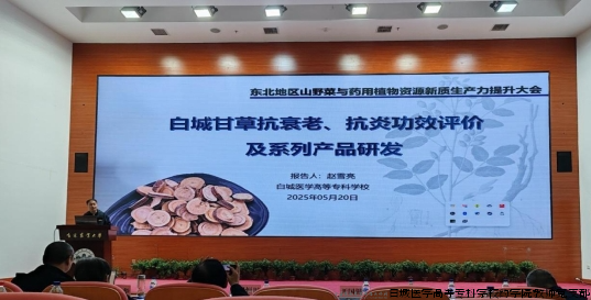 学校赵雪亮博士受邀参会,并以《白城甘草抗衰老、抗炎功效评价及系列产品研发》为题作专题报告。报告介绍了白城甘草的种植历史、围绕白城甘草的研究布局及其团队在白城甘草抗衰老、抗炎领域的研究进展进行阐述,相关内容受到了与会专家的高度评价。通过本次学术报告,有力宣传了白城甘草的药用价值与产业潜力。这一学术实践既彰显学校在药用植物研究领域的创新实力,也通过特色资源开发提升了社会影响力,为学校创建医学本科大学积累了学科优势与社会认可。