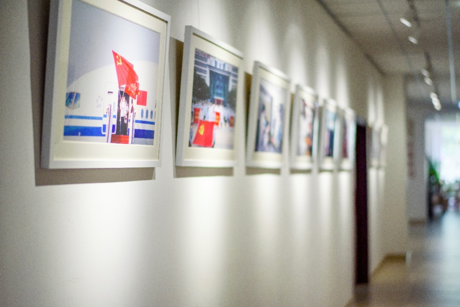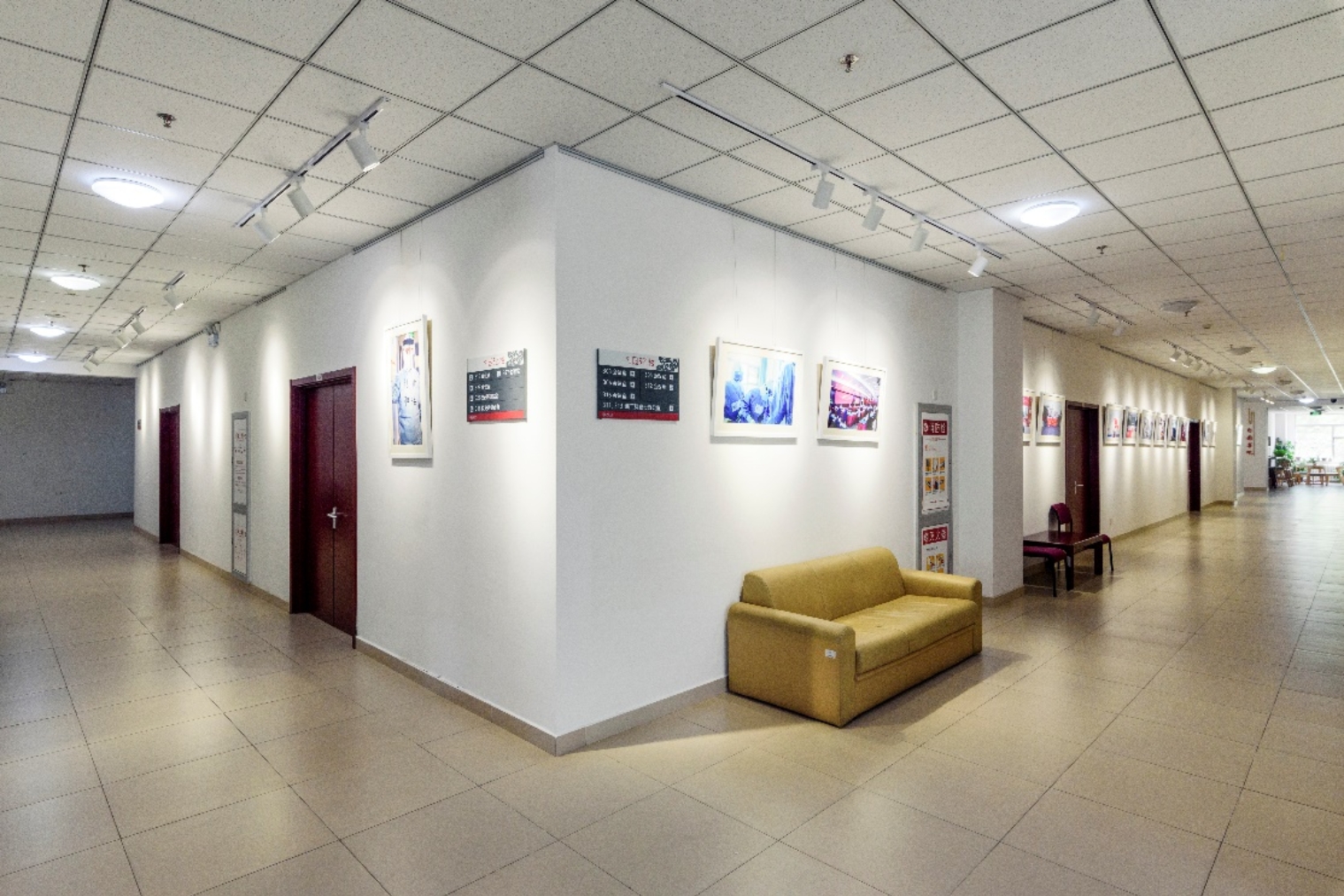 “回”字形会议区走廊加装了挂画轨道和射灯,定期展出不同主题的展览。首期展览由机关党委和党委宣传部共同策划,展出“教育系统抗疫斗争伟大实践影像、海报展”中与北京大学相关的影像资料。
