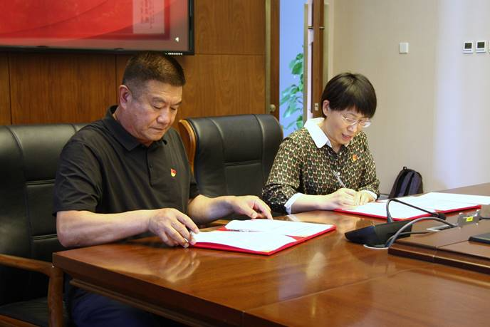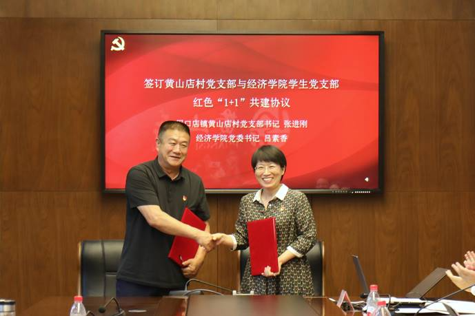 周口店镇黄山店村党支部书记张进刚与经济学院党委书记吕素香共同签订黄山店村党支部与经济学院学生党支部红色“1+1”共建协议。