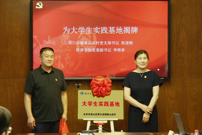 周口店镇黄山店村党支部书记张进刚与经济学院党委副书记李艳春共同为大学生实践基地揭牌。