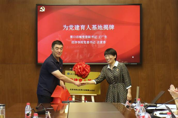周口店镇党委副书记王广生与经济学院党委书记吕素香共同为党建育人基地揭牌。