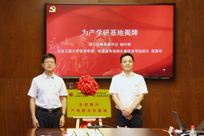 周口店镇党委书记杨叶辉与北京工商大学党委常委、党委宣传部部长兼经济学院院长倪国华共同为产学研基地揭牌。