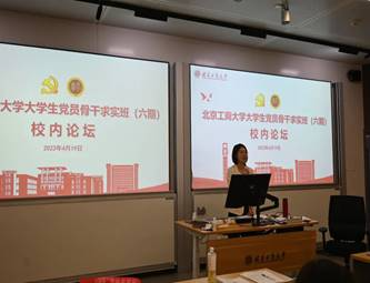 4月19日,北京工商大学大学生党员骨干“求实”班(六期)校内论坛顺利召开,第六期“求实”班全体学员均为各学院学生党支部书记及支委成员,经济学院本科生党建专项辅导员李锦介绍了金融本科生党支部的“六型”党支部建设情况与开展学习贯彻习近平新时代中国特色社会主义思想主题教育的活动、举措与制度。