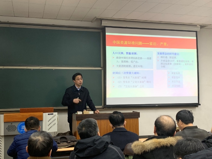 2019年12月18日,学院召开党的十九届四中全会精神宣讲会,邀请马克思主义学院党委副书记、院长李东松教授作题为《从环境问题大国走向世界生态文明建设引领者》专场报告。学院领导干部、师生党员代表参加宣讲会。学院党委书记夏国栋主持宣讲会。