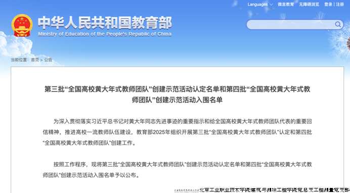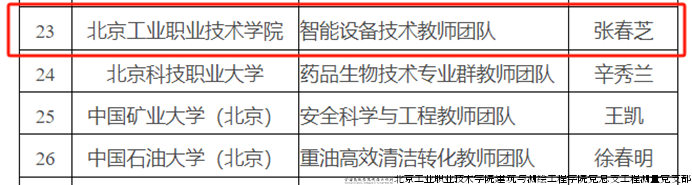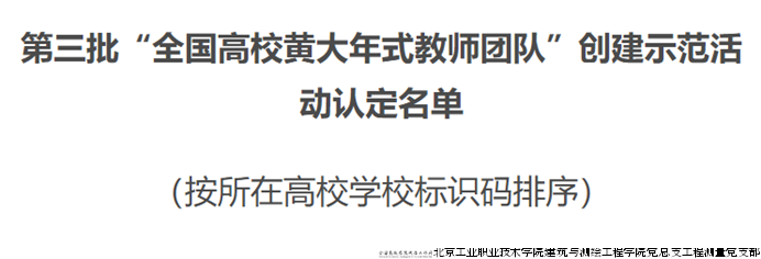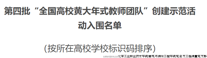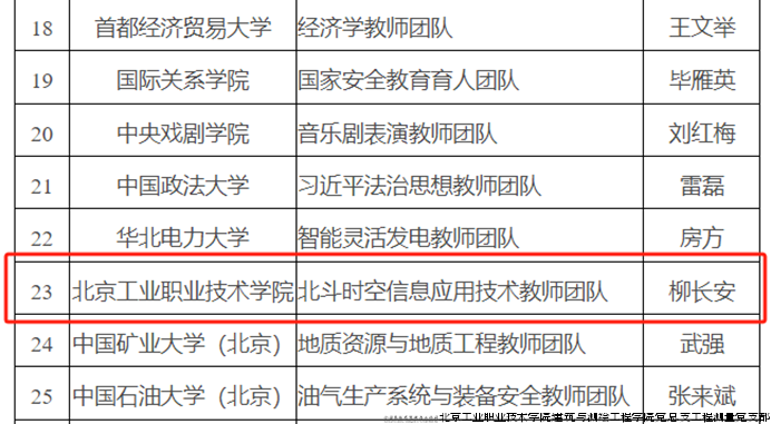 近日,教育部公布了第三批“全国高校黄大年式教师团队”认定名单和第四批创建示范活动入围名单。柳长安院长带领的“北斗时空信息应用技术教师团队” 成功入围第四批创建示范名单。北京工业职业技术学院机电工程学院张春芝教授带领的“智能设备技术教师团队” 成功入选第三批认定名单。