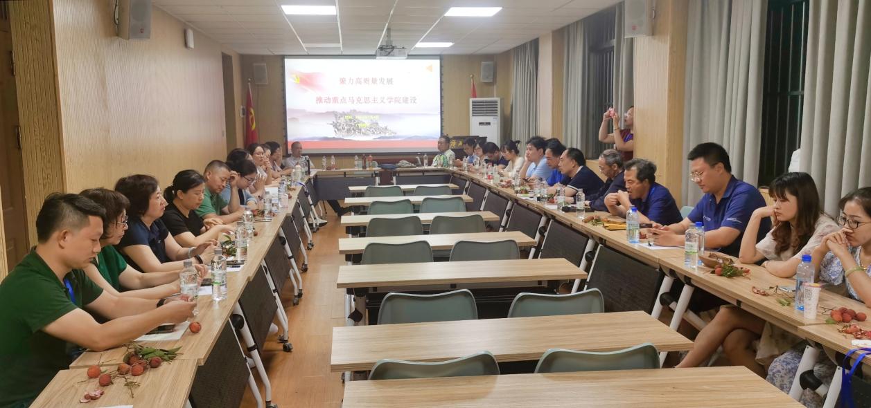为进一步贯彻落实中共中央办公厅《关于加强新时代马克思主义学院建设的意见》,推进北京市重点马克思主义学院建设,7月4日晚,马克思主义学院在全国高校思想政治理论课教师研修基地(广西大学)102会议室,召开学院高质量发展交流座谈会。会议由学院院长贾钢涛教授主持,参加研修的学院领导和全体教师参加。