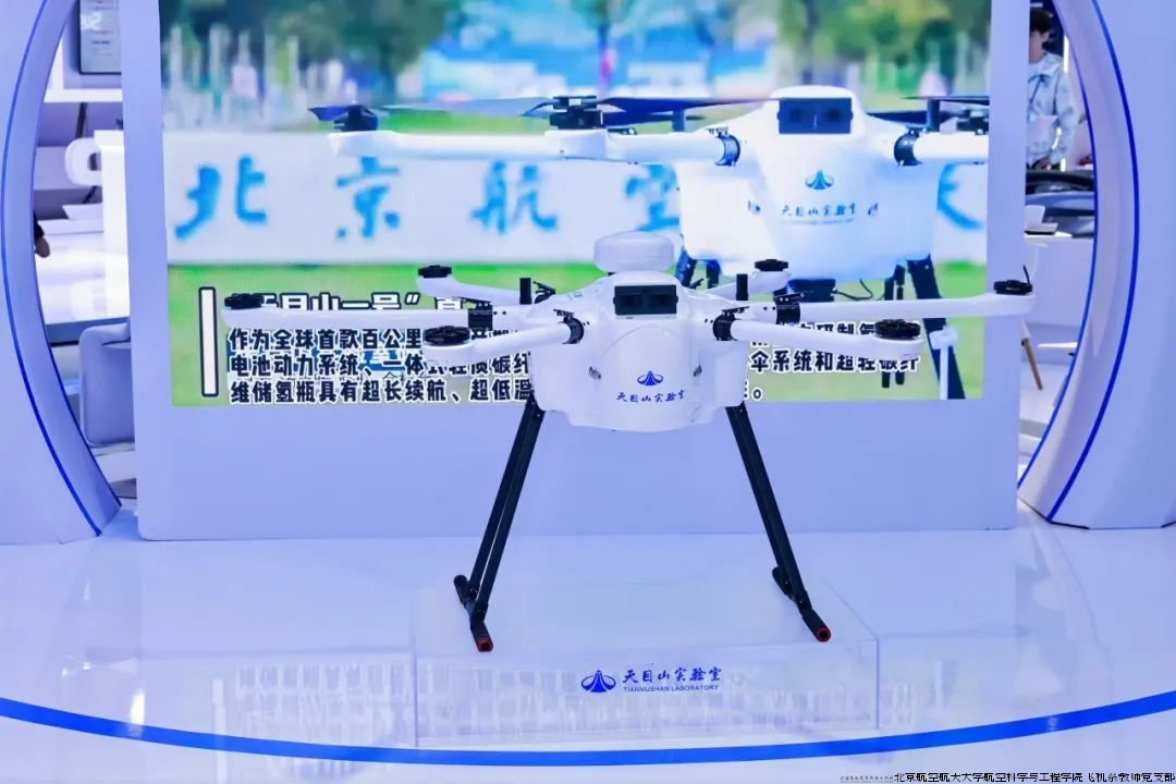 在本次展会中,北京航空航天大学飞机系徐伟强老师带去了他依托天目山实验室(瞄准浙江省“高水平建设民航强省、打造低空经济发展高地”的战略目标,聚焦先进航空技术和高性能航空材料两大主攻方向)打造并成果转化的“天目山一号”氢动力长航时无人机。该机采用自主研制氢燃料电池动力系统、一体化轻质碳纤维机身,集成智能降落伞系统设计,具有超长续航、超低温适应性和零碳环保特性。空机重量19kg,最大挂载重量6kg,最大续航4小时,完成-40℃极寒条件连续飞行测试、4000米高海拔飞行性能测试,主要性能和产品设计达到行业领先水平。已获得浙江省首台(套)产品证书、中国设计智造大奖(DIA)佳作奖、浙江省先进技术转化应用大赛二等奖等奖项。在AI技术的赋能下,“天目山一号”具备超视距百公里连续自主作业能力,改变传统工业无人机的应用模式,已在油气、电力、森林、江河、海岛等多场景获得示范应用,尤其在连续长距离作业和北方高寒条件下具有不可替代性,具有巨大的市场推广应用前景。