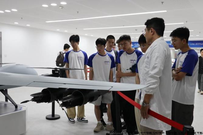 在飞行器平台展区,倾转旋翼机、氢动力无人机、混动无人机等丰富的天目山系列型号研究成果进一步开拓了同学们的眼界,同学们向老师深入请教在这些型号中所应用到的“激光+视觉”融合导航、快拆式燃料电池、“海豚”流线造型设计等前沿技术,直观感受到了尖端科技在低空经济领域的加速转化。