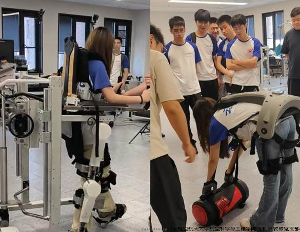 在研究院展厅,实践队员通过全息投影了解了杭研院的发展历程和布局。在机器人实验室,同学们亲自体验了助力外骨骼装备:辅助行走设备可以识别患者的走路步态,精准助力腿部受伤群体的康复;腰部支撑装置可以使女生可以轻松托举30公斤重物。在无人机实验室,老师向同学们展示团队研发成果并讲述育人方案,同学们惊叹于实验室集结构、控制、组装、测试于一体的人才培养模式。