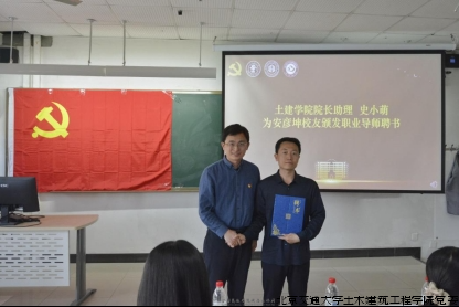 学院院长助理史小萌为我院优秀校友安彦坤颁发“职业导师”聘书,旨在借助优秀校友的榜样力量,增强学生的专业认同感和行业自信心,加强学生职业生涯规划教育。