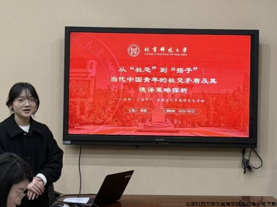 在学术论坛环节开始前,“小语种·大视野”系列活动的发起人、德语系教师刘冬瑶回顾了该系列的缘起与发展,并展望了论坛可能催生的学术成果与传播价值。随后的学术汇报环节中,2025级的八位研究生围绕“理解当代中国”这一核心主题,聚焦当下流行的社会热词与青年文化现象,展开了多维度、跨学科的深度探讨。论坛选题丰富多元,从“社恐”“搭子”“草台班子”折射的社交图景与职场哲学,到“浓人”“淡人”“松弛感”勾勒的性格标签与群体心态;从“种草”“拔草”背后的消费行为变迁,到“打卡”“回头客”体现的旅游体验升级,再到“电子榨菜”所满足的情绪需求,以及“夏季节气”等官方话语的外宣翻译策略,汇报内容紧密贴合时代脉搏。同学们灵活运用翻译理论与跨文化视角,深入探讨了这些中国话语的德语阐释与传播策略,展现了出色的语言分析能力与文化洞察力,呈现了一场“语言为基、思想为核、时代为镜”的学术盛宴。