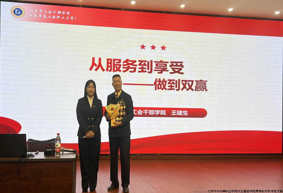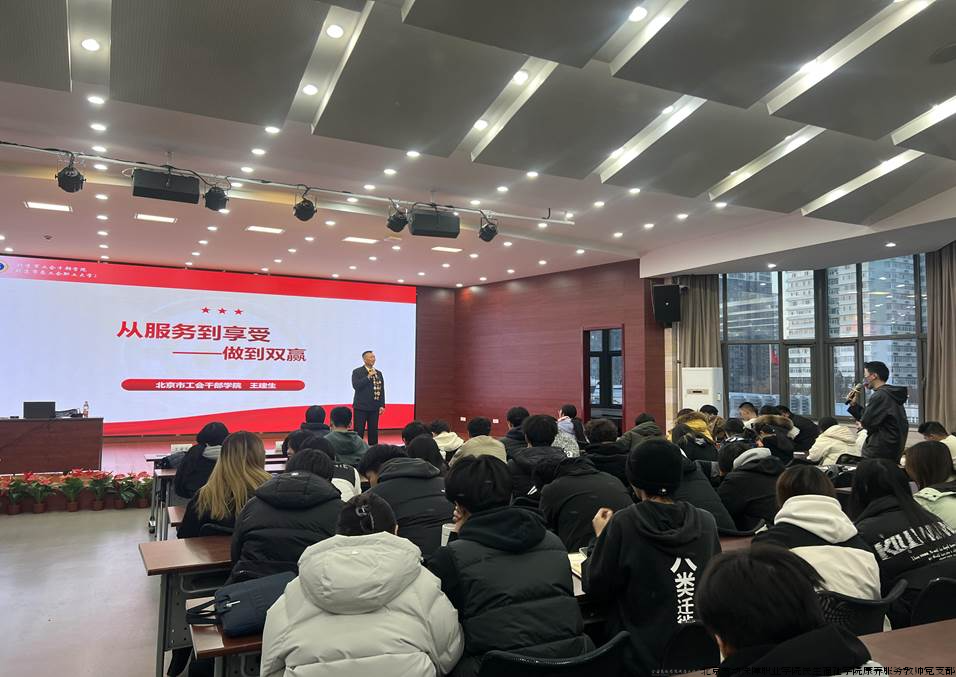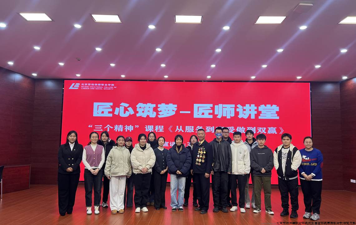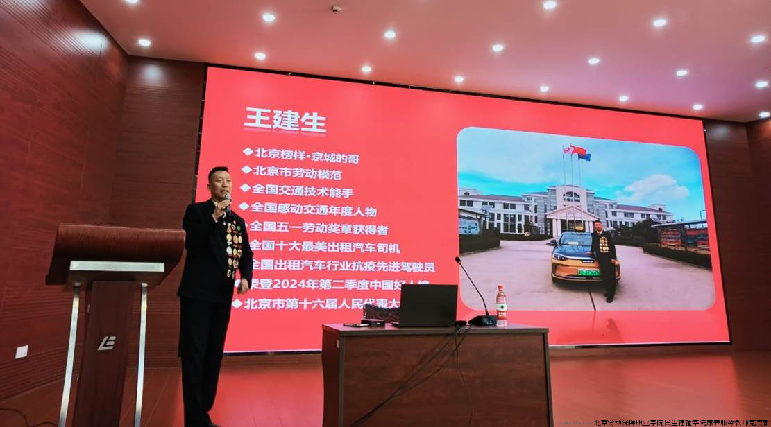 北京劳动保障职业学院南校区六层多功能报告厅举行了一场别开生面的“匠心筑梦-匠师讲堂”活动。此次活动特邀北京北方出租汽车有限责任公司职工匠师王建生为大家讲授了一堂生动的“三个精神”课程《从服务到享受——实现双赢》,用劳动精神、劳模精神、工匠精神激励大家立足实际,逐梦青春。