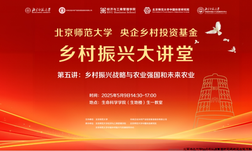为了更加有力有效推进乡村全面振兴、加快农业强国建设贡献更多力量,由北京师范大学和国投创益产业基金管理有限公司主办,北京师范大学经济与工商管理学院、北京师范大学中国扶贫研究院、北京师范大学中国乡村振兴与发展研究中心承办,北京师范大学经济与工商管理学院经济与资源管理研究生党支部协办的“北京师范大学/央企乡村投资基金·乡村振兴大讲堂”第五讲于2025年5月9日在北京师范大学举行。乡村振兴大讲堂宗旨在于邀请国内著名专家学者进行乡村振兴领域理论热点阐释、形势政策解读和学术宣传推介,构建中央企业和高校科研平台合作服务国家战略的特色宣传载体。