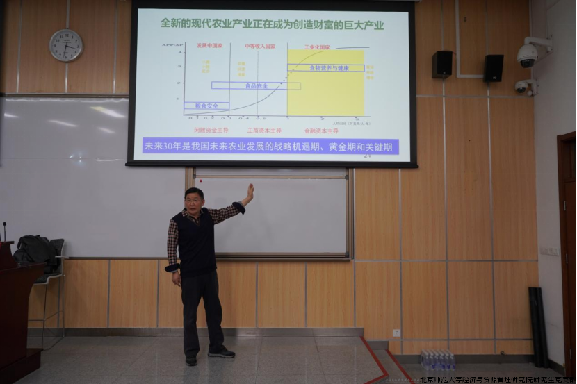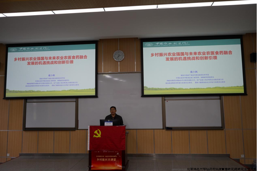 北京师范大学经济与工商管理学院副教授、北京师范大学中国扶贫研究院副院长万君主持了本次大讲堂。主讲专家是中国农业科学院二级研究员、博士生导师,国务院特殊津贴获得者、农业部有突出贡献中青年专家戴小枫。戴小枫研究员历任中国农业科学院科技局副局长、食品加工所和饲料所所长,国家中药材产业技术体系岗位科学家,兼任国务院食物营养咨询专家委员会委员、农业部科技委委员、国家卫健委食安委委员、中央军委科技委委员等。国务院国资委相关领导、国投创益等30余家中央企业相关代表、北京师范大学经济与工商管理学院等院系200余名师生党员参加了本次讲座。