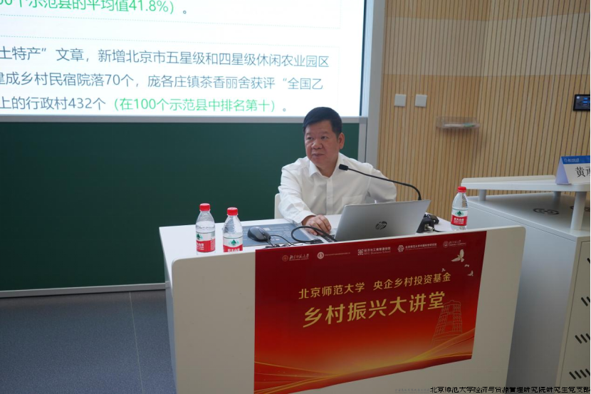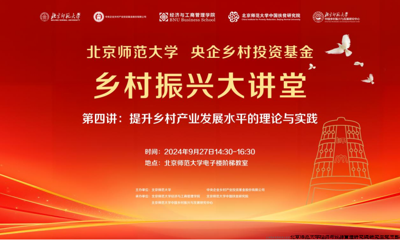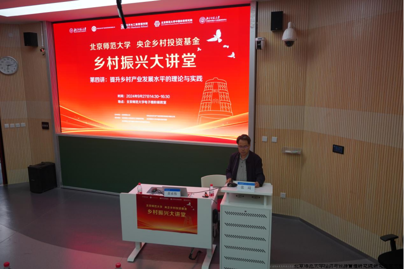 为了更加有力有效推进乡村全面振兴、加快农业强国建设贡献更多力量,由北京师范大学和国投创益产业基金管理有限公司主办,北京师范大学中国乡村振兴与发展研究中心承办,北京师范大学经济与资源管理研究生党支部协办的“北京师范大学/央企乡村投资基金·乡村振兴大讲堂”第四讲于2024年9月27日在北京师范大学举行。乡村振兴大讲堂宗旨在于邀请国内著名专家学者进行乡村振兴领域理论热点阐释、形势政策解读和学术宣传推介,构建中央企业和高校科研平台合作服务国家战略的特色宣传载体。
