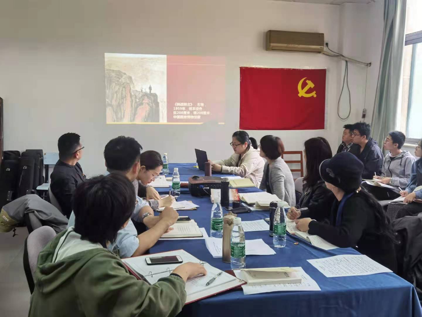学习研讨会由党总支副书记王杨主持。会议首先由教师党支部邬树乙、史大鹏两位老师结合经典艺术作品分享党史学习体会。邬树乙老师分享了美术经典中的党史:以毛泽东为主题的革命历史题材画作《转战陕北》,介绍了这一画作诞生的背景故事、创作构思和历史意义。《转战陕北》是现代画家石鲁1959年创作的一幅中国画,整幅以崇山峻岭的宏伟气魄为烘托,将毛主席置于巍峨的群山之中,人物虽小,却神形兼备,热情歌颂了毛主席为中国革命事业所做出的丰功伟绩。史大鹏老师从创作者、创作背景和风格特色及历史意义四个方面介绍了笛子演奏家赵松庭的经典笛子独奏曲《早晨》。这首曲子创作于1952年建国初期的抗美援朝战争时期,以“早晨”一语双关,既描绘了春天的早晨太阳从东方升起的宁静,也表达出了对新中国如初升的太阳引领全国人民通往幸福生活的美好希冀。教师支部与学生支部成员认真聆听两位老师的讲述,通过一幅画作、一首曲子品读经典背后的历史,无不受到深深的感染和教育。