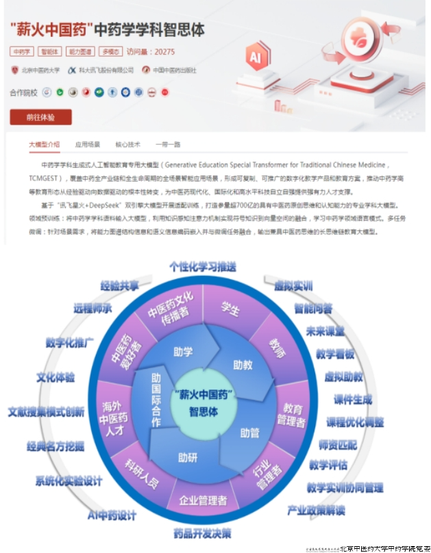 该项目根据《教育部等九部门关于加快推进教育数字化的意见》文件精神,由北京中医药大学牵头,联合国家“一带一路”节点城市高校和龙头技术企业联合打造,依托“讯飞星火+DeepSeek”双引擎和中医药全产业链数字资源,围绕“助学-助教-助研-助管-助国际合作”五大场景,打造参量超700亿、具备中医药原创思维和跨学科知识能力的超级大脑。日前,“薪火中国药” 智思体1.0测试版已在相关联合体高校上线试运行,受到师生好评,发挥了生成式AI赋能中医药教育的引领和示范作用。未来,“薪火中国药”将持续深耕,突破通用大模型在教育领域应用的局限,构建开放共享的智慧教育新生态,为中医药教育改革和教育强国建设贡献智慧和力量。