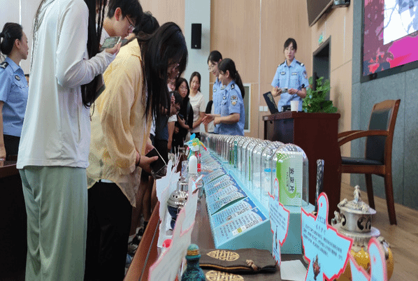 在活动现场,禁毒普法宣传人员结合一线工作的丰富经验和真实案例,为师生们细致地介绍了毒品的种类与危害以及中国禁毒史与毒品犯罪相关的法律法规,告诫同学们要提高毒品对人类、社会、国家危害程度的认知,在日常生活中保持高度警惕性,远离毒品。在仿真毒品展示环节,警官们向同学们展示了传统毒品与新型毒品的种类,尤其是变身为“糖果”、“止咳水”、“开心水”等与日常药品、零食毫无差别的新型毒品,增强了现场师生对新型毒品的辨别能力。