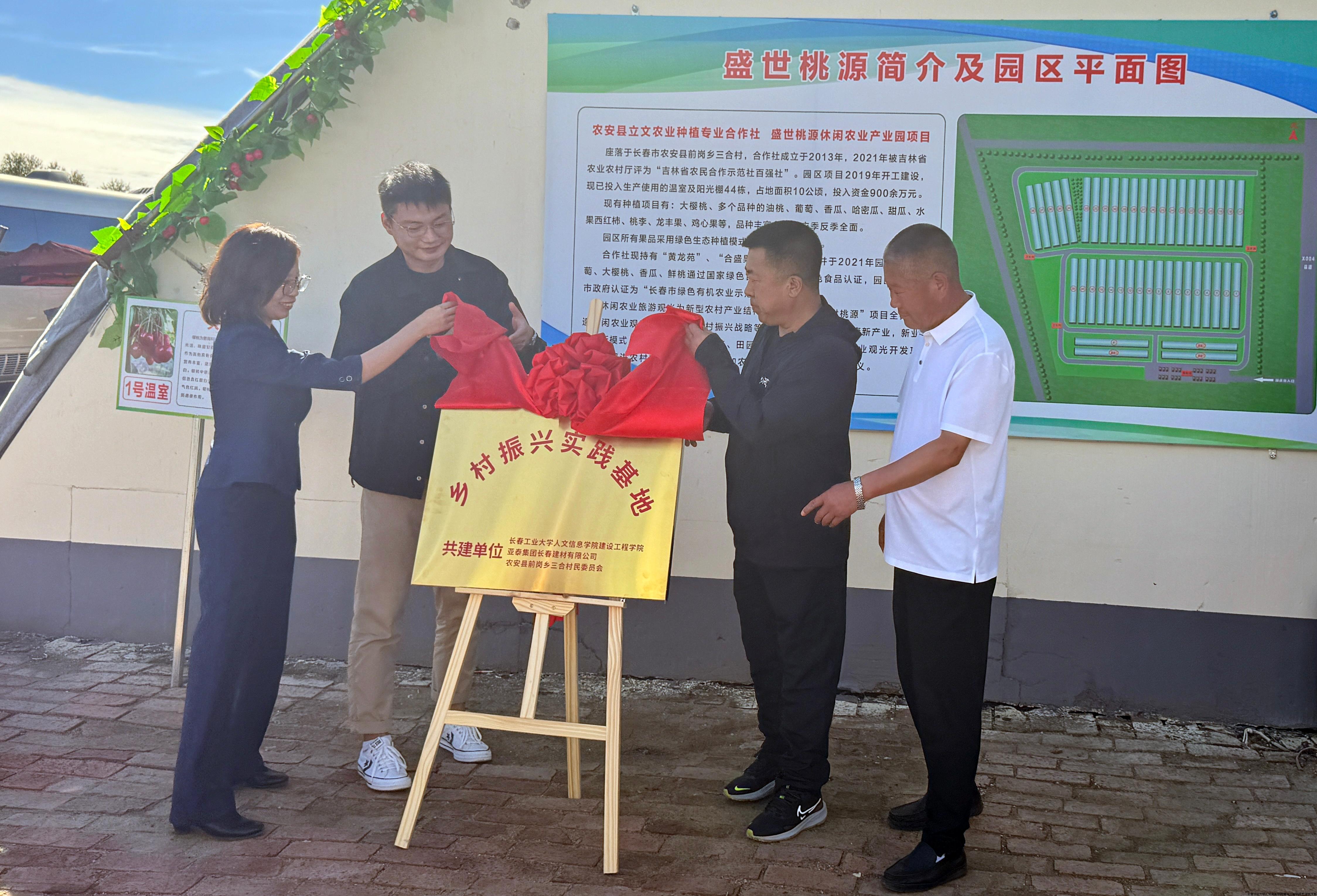 前岗乡党委书记郑庆锋、建设工程学院院长孙娜、亚泰集团长春建材有限公司人力资源部部长荣超群、前岗乡三合村党总支书记陶立文共同为校企地共建的“乡村振兴实践基地”揭牌。