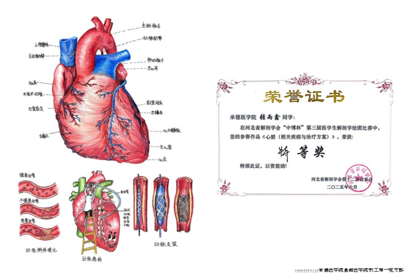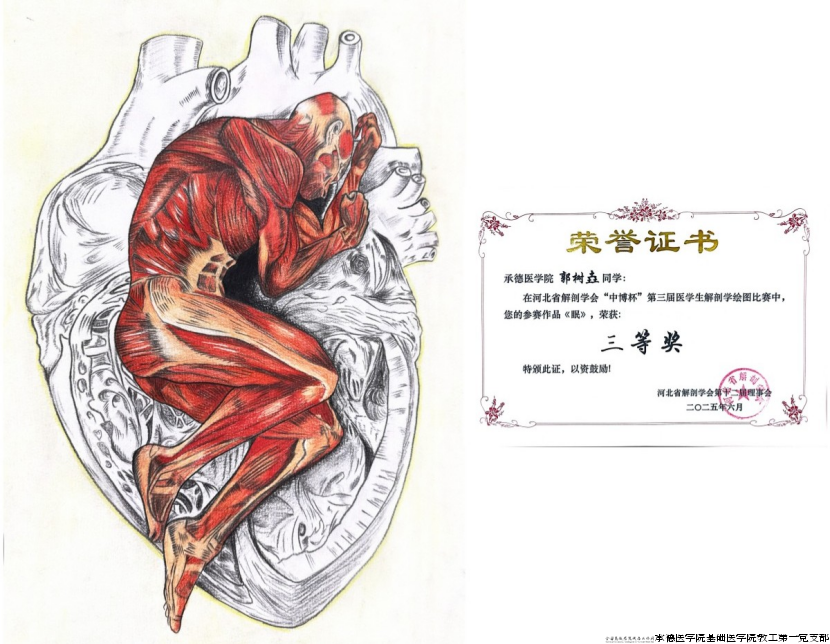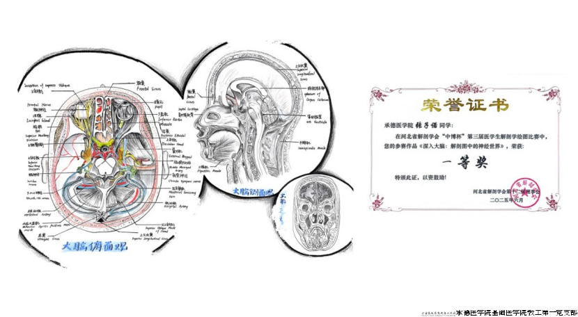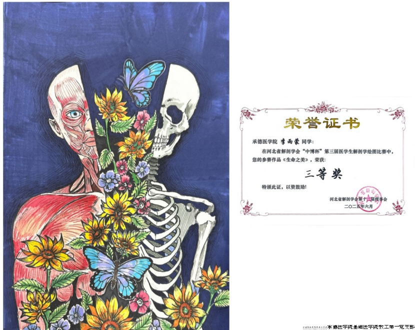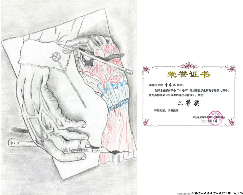 河北省解剖学会主办的“中博杯”第三届医学生解剖学绘图比赛于2025年6月14日在河北省邯郸市圆满落幕。比赛共收集20所院校近千幅绘图作品,经比赛初审专家团评审,共125幅作品晋级绘图比赛复赛。我校推送的12幅作品从众多参赛作品中脱颖而出,获得佳绩,充分展现了我校学生扎实的解剖学知识储备及绘画功底。同时,在此次比赛中我校付文亮、刘东慧、王福、张乘云、李海
