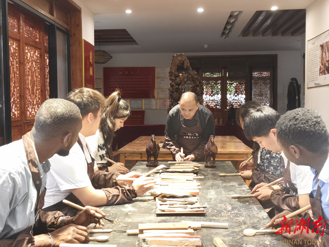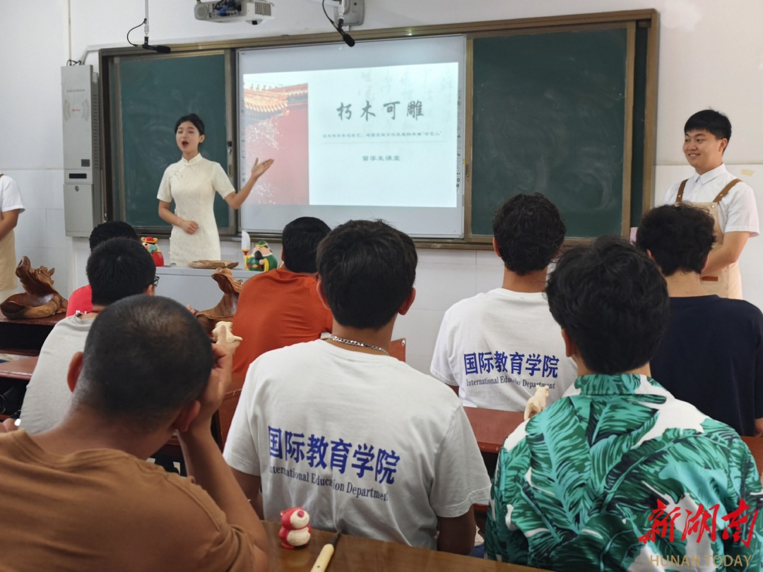 为留学生上“桃源木雕”非遗文化课
