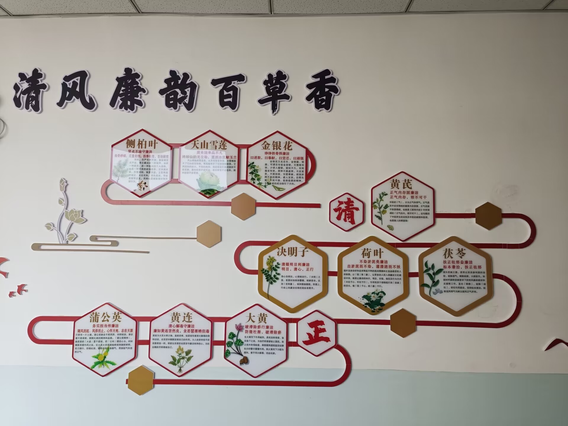 分院坚持党建引领,将医学专业文化和党风廉政文化融为一体。在“清风廉韵百草香”的版面上,将中药功效同廉洁文化巧妙的融合在一起,用大家熟悉的天山雪莲来比喻顽强毅力、不屈精神,用金银花来比喻不贪富贵、不图虚荣的品质,用大黄来比喻防微杜渐、破滞除淤的警示作用。