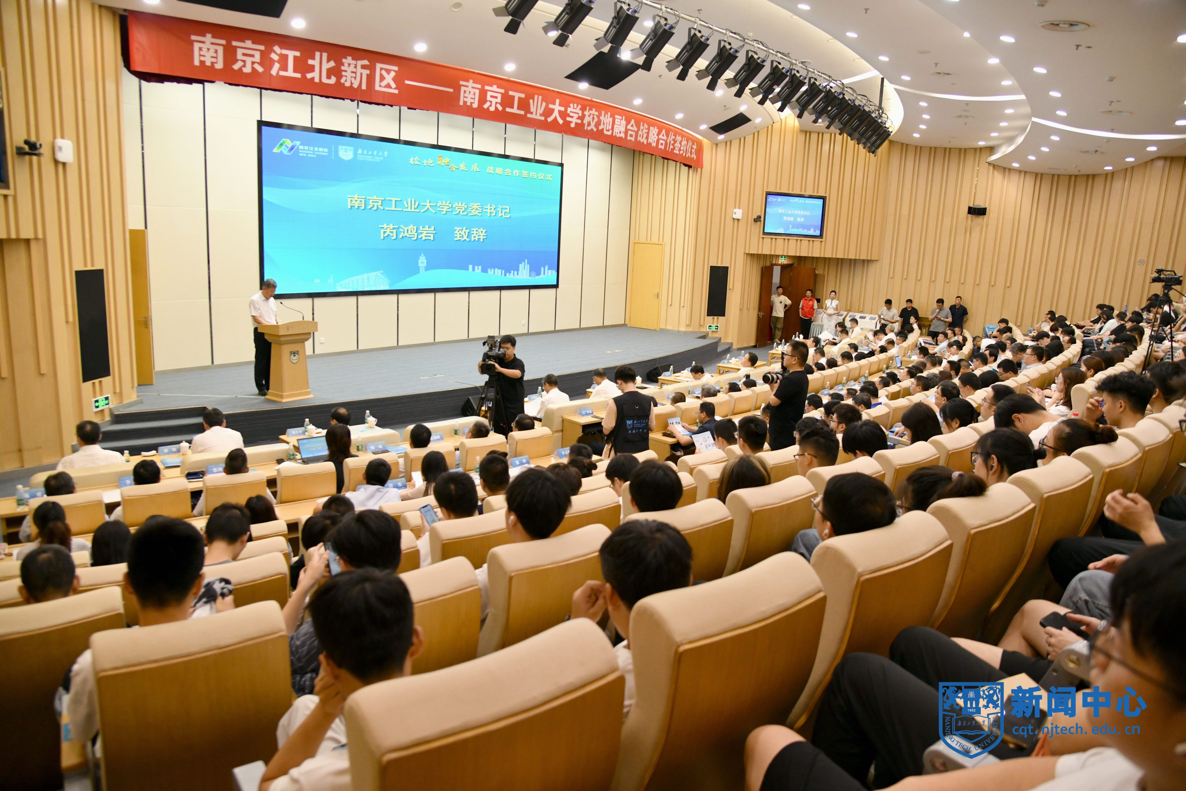 7月18日,南京江北新区——南京工业大学校地融合发展战略合作签约仪式在江浦校区弘毅楼报告厅举行。省委教育工委副书记、省教育厅党组成员潘漫,南京市委常委、南京江北新区党工委书记陆卫东,校党委书记芮鸿岩出席活动并致辞。南京江北新区党工委副书记袁传军、南京江北新区管委会副主任王伟,全体在校校领导参加活动。校长蒋军成主持签约仪式。