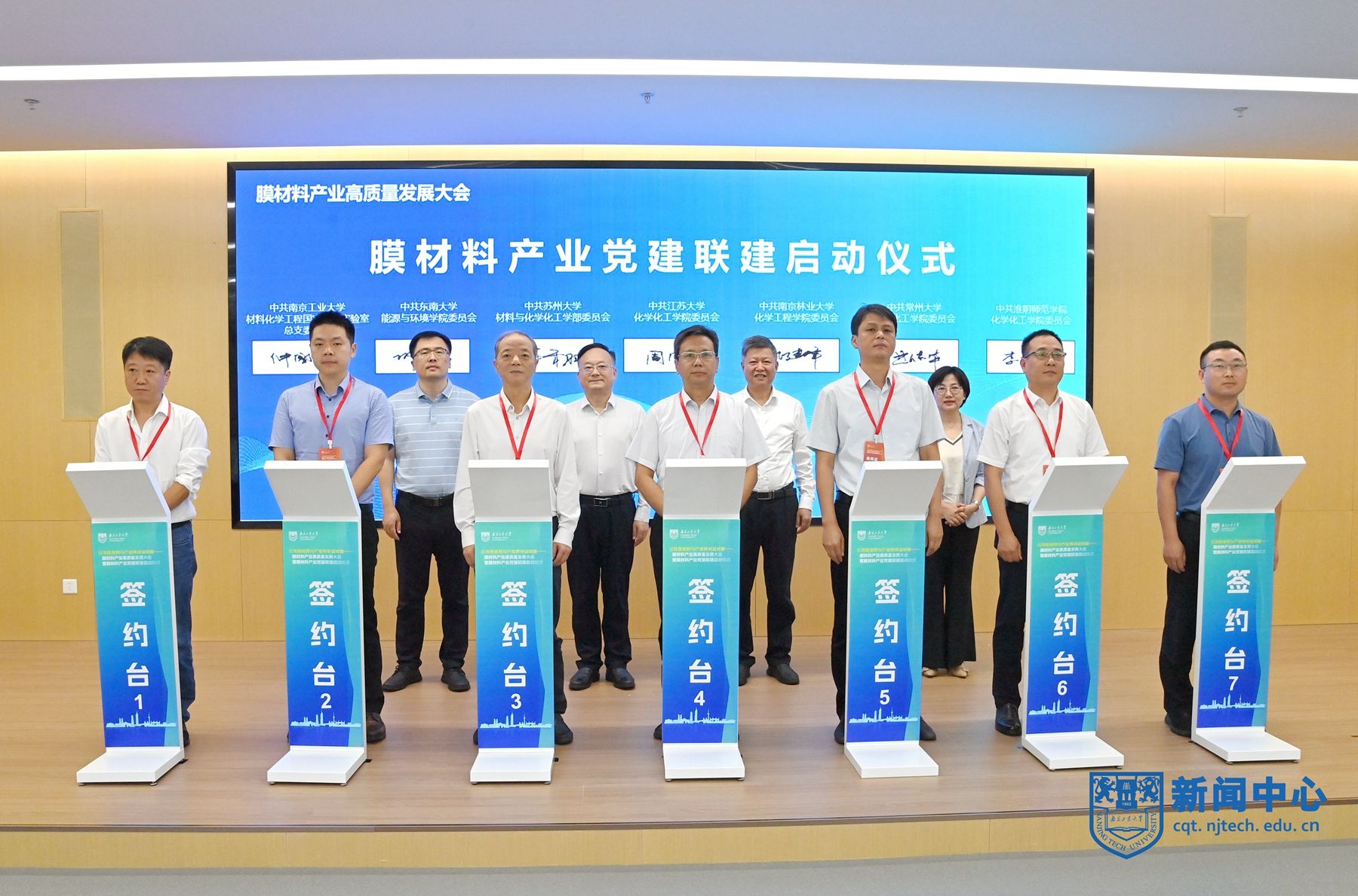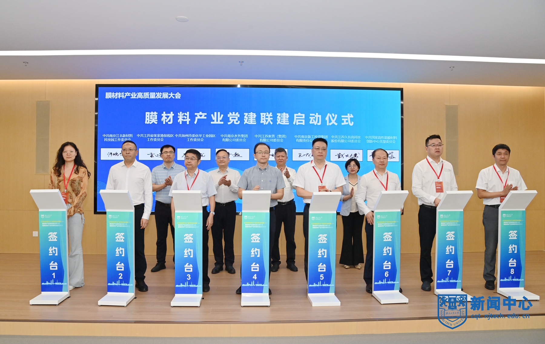 膜材料产业党建联建启动仪式由吴胜红主持,来自南京工业大学、东南大学、苏州大学、江苏大学、南京林业大学、常州大学、淮阴师范学院等高校,南京江北新材料科技园、张家港保税区、扬州化工园区等园区,以及南京水务集团、江苏索普集团、南京新工集团、江苏久吾高科、国家高性能膜材料创新中心等企业的15家党组织代表现场签署膜材料产业党建联建协议。国家高性能膜材料创新中心党支部是南京工业大学材料化学工程国家重点实验室教师第一党支部为骨干成立的功能型党支部,支部书记李卫星参加了共建签约启动仪式。