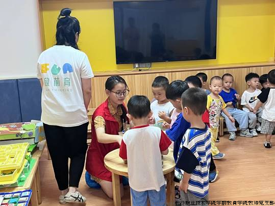 “一滴水”志愿服务队进班给放芯育托幼中心幼儿赠送学前教育学院学生在《学前儿童游戏》课程中自制的智力游戏玩教具,学生党员讲解示范了玩教具玩法并与幼儿一同开展玩教具游戏。活动中教师组织有序,语言简洁明了,孩子们在玩中学、学中玩,乐在其中。