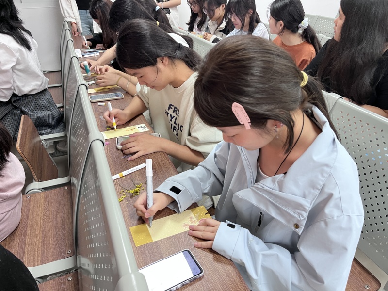 活动现场,同学们围绕二十四节气主题展开创作,将节气特征、诗词谚语与艺术表达巧妙融合。春分书签上,浅青与鹅黄的水彩晕染出燕舞莺啼的生机,几片压平的樱花花瓣定格了“春分麦起身,一刻值千金”的农忙序曲,每一个节气都被赋予了独特的视觉表达。同学们用细腻的笔触勾勒出节气的特色,用五彩斑斓的色彩描绘出季节的变换,更在方寸之间融入对传统文化的深刻理解。