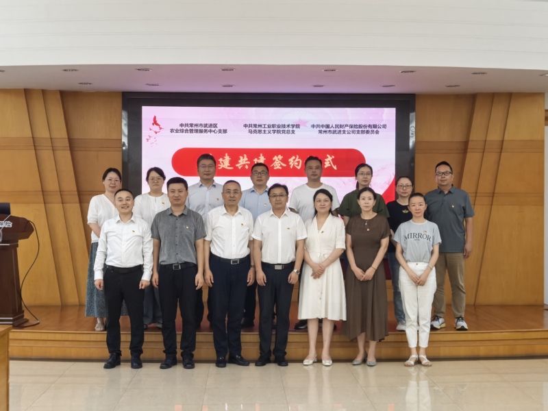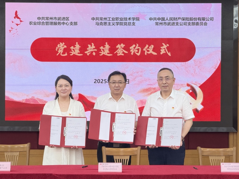 为探索党建共建新模式,凝聚服务地方发展合力,7月3日,常州工业职业技术学院马克思主义学院党总支、中国人民财产保险武进支公司党支部、武进区农业综合管理服务中心党支部联合举行党建共建签约仪式。三方党组织负责人出席活动。