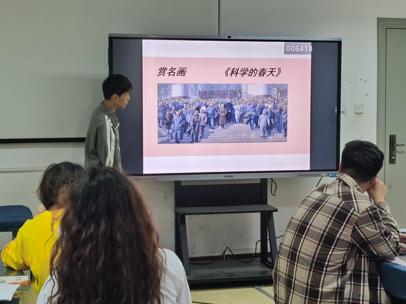 各班代表分享名画,立足美术语言,从虚实空间、色彩明暗、造型构图等三方面来品鉴伟大的历史画卷,从创作历史背景到产生的深远影响娓娓道来。《起航——中共一大会议》《中国大典》《科学的春天》……一幅幅经典画作,不仅让同学们了解了绘画手法与技巧,更是从名画中进一步了解了党史。