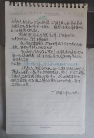 利用这段时间,我继续读了之前没有读完的路遥的《平凡的世界》这本书。小说以少安、少平等几名生长在双水村的年轻人的成长故事为主线,他们在经历生活的重重磨难后,活出了不一样的美丽人生。我喜欢书中孙少安这个人物形象,虽然苦难,但仍然满怀希望。于他而言,生命的过程不是轻歌曼舞,繁花似锦,更不是雅阁品茗,生命的意义在于负重前行。虽然平凡,但仍不懈追求。一边是生活的困苦,一边是精神的富足,不曾懈怠,内心始终葆有强大的力量,在贫穷的现实面对,勇于面对,懂得感恩。另一位少平这个人物用自己的行动诠释了平凡人对于工作的极度热爱,诠释了平凡人对苦难的深刻认识,诠释了平凡人对生活的深邃理解。当他站在奋斗多年的土地上,看到太阳永恒的为微笑,那一刻涌满泪水,我想,他看到的是负重前行的意义,进而发出了最有力的感悟:“什么是人生,人生就是永无休止地奋斗,只有选定目标,并在奋斗中感到自己的努力没有虚掷,这样的生活才是完美的,精神才会永远年轻。”这不正是我们作为一名青年学生该学习的精神吗!这部小说读起来,不禁使我热血沸腾。我认为它成功的解读了苦难和奋斗,平凡和伟大。反思我们现在生在和平的年代,活在幸福的国度,但仍需要困境中不忘坚持,苦难中不忘前行。做一个平凡的的人,努力前行,找寻属于我们的海阔天空,在平凡的生活中依旧可以活出不平凡但又精彩的人生!