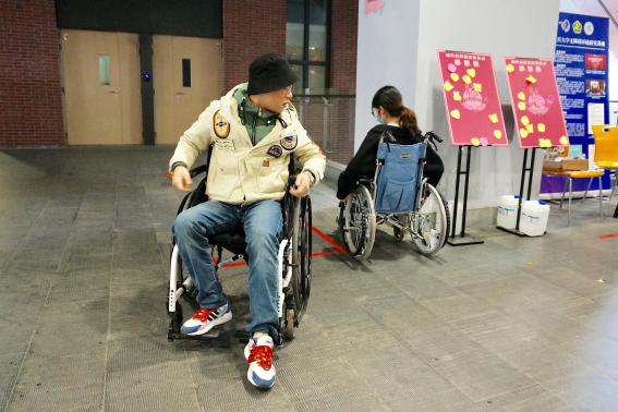 在轮椅体验区中,体验者被要求坐在轮椅上,仅靠手部力量来控制轮椅的进退与方向,以“S”型路径通过4个障碍。许多参与体验的同学之前都认为轮椅的使用十分简单,而经过实际体会后才发现,初次体验时甚至连控制轮椅方向、减速、正确地上下轮椅都难以操作,这不仅颠覆了许多同学的认知,也让大家对残障人士的生活日常有了更实在的认识。