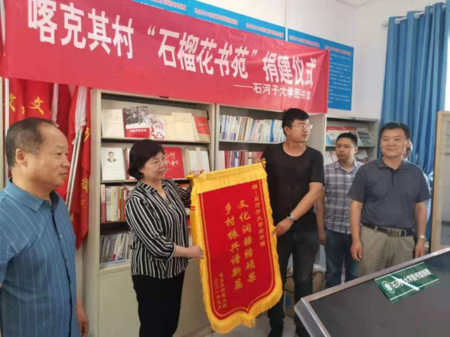 5月17日至23日,石河子大学图书馆一行4人载着全体馆员的重托,驱车1600多公里从石河子市奔赴巴合其乡喀克其村,捐建了“石榴花书苑”农村书屋,送去包括科普图书、种植养殖、果树栽培、牧业农机等内容的书籍300余册、学习文具100件、体育活动用品50件,以及各类活动器材。