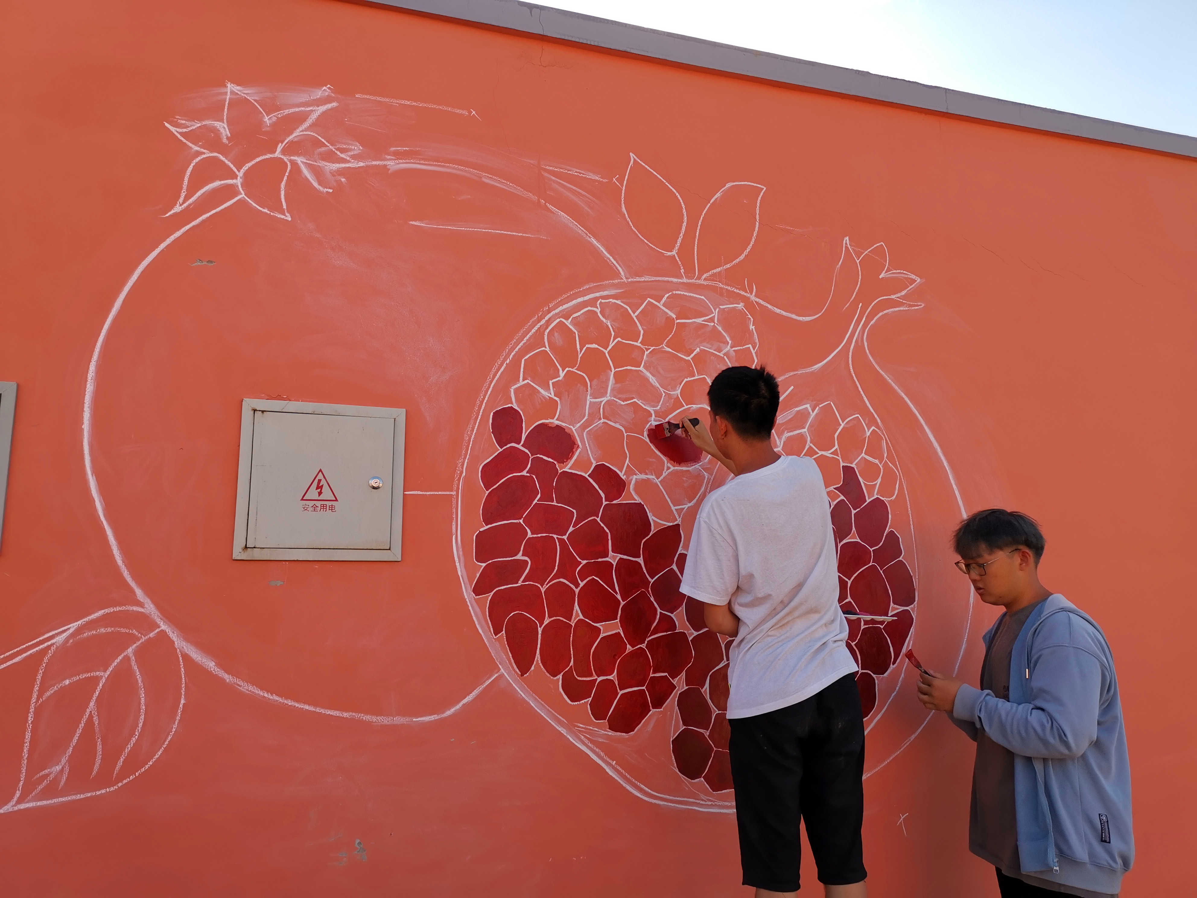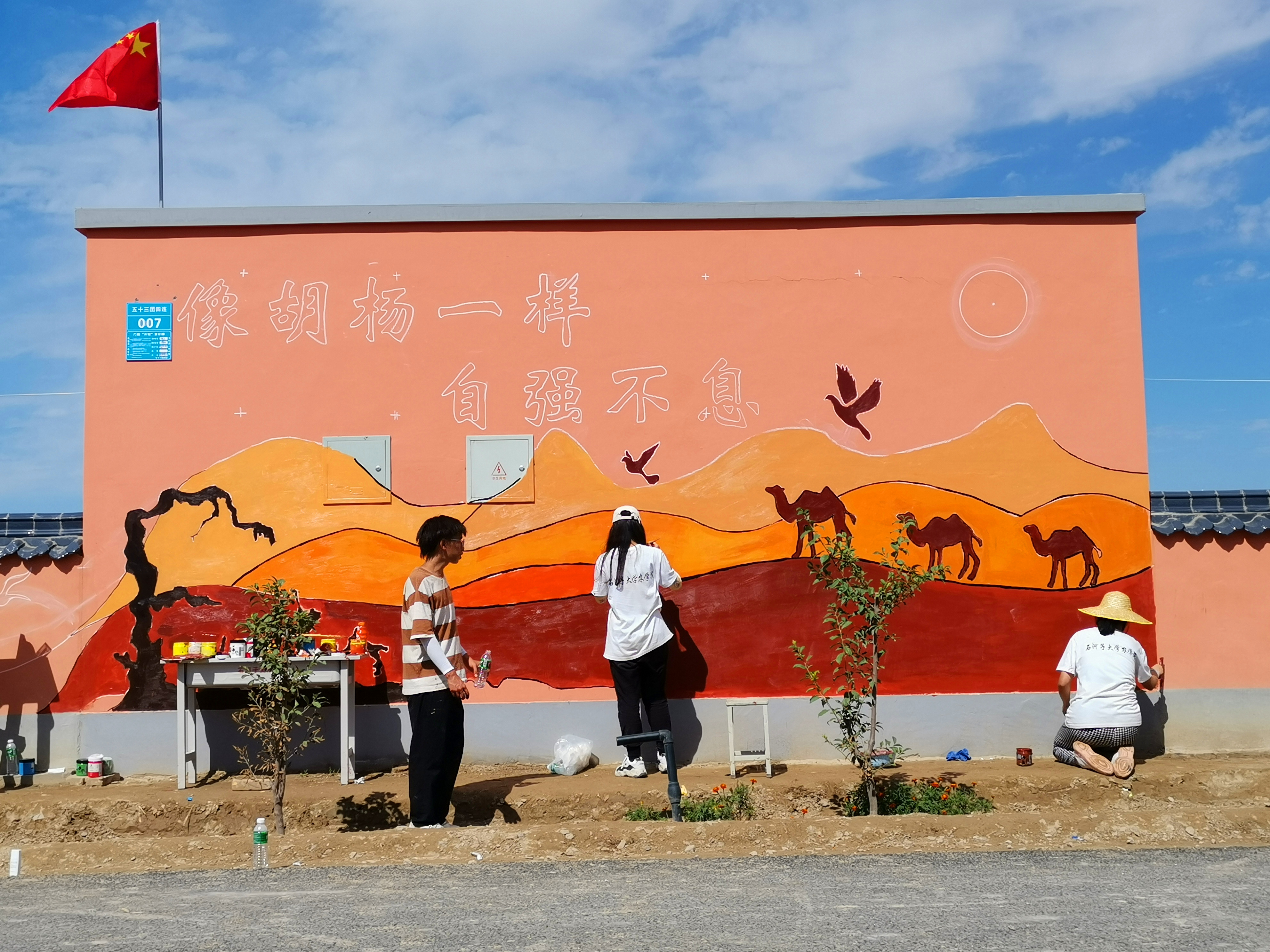 通过实地调研,同学们设计并绘制了以“人才振兴”“美丽乡村”“民族团结”“胡杨精神”为主题的16幅墙绘图案,及49幅矮墙图案,顺利完成1100平方米墙体实地绘制。