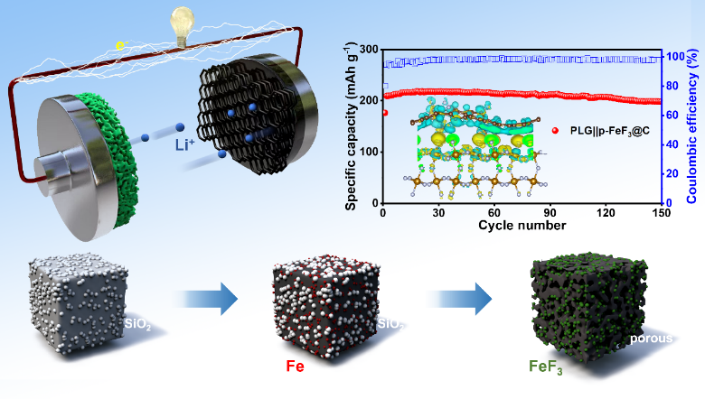 在此项研究中,梁济元和杜康通过一步氟化并刻蚀的方法,开发了具有丰富孔隙结构的p-FeF3@C复合无锂正极材料,用于高比能量和长循环寿命的锂离子电池正极。通过基本的物理化学性质的表征手段证明了多孔结构和活性物质的生成,组装的锂半电池展现出了十分优异的电化学性能。容量分析和恒电流间歇滴定技术(GITT)测试证明了该复合材料具有优异的电容贡献和Li+扩散速率。研究所提出的合成策略具有广泛的普适性,研究工作成功地揭示了原位蚀刻/氟化策略合成纳米多孔TMFs@C复合材料的巨大潜力。